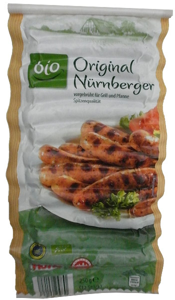 Seit einigen Wochen bietet Aldi Süd 12 Original Nürnberger in Bio-Qualität an. Die 12 Würstchen entsprechen 250 Gramm und kosten im SB-Regal 2,99 €, was einem kg-Preis von knapp 12 € entspricht.